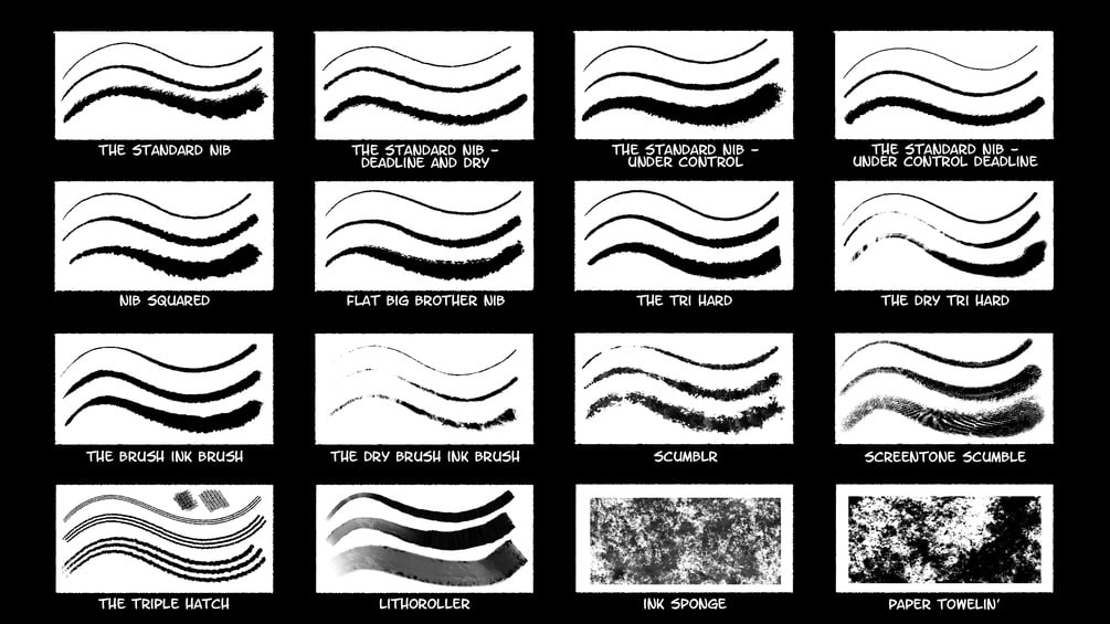All of these brushes have been custom-made, hand-tested on page after page of digital comics, all by me. Brush shapes, grains, and everything down to suggested brush sizes are all done by me too. Now all you need to do is get this pack.